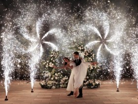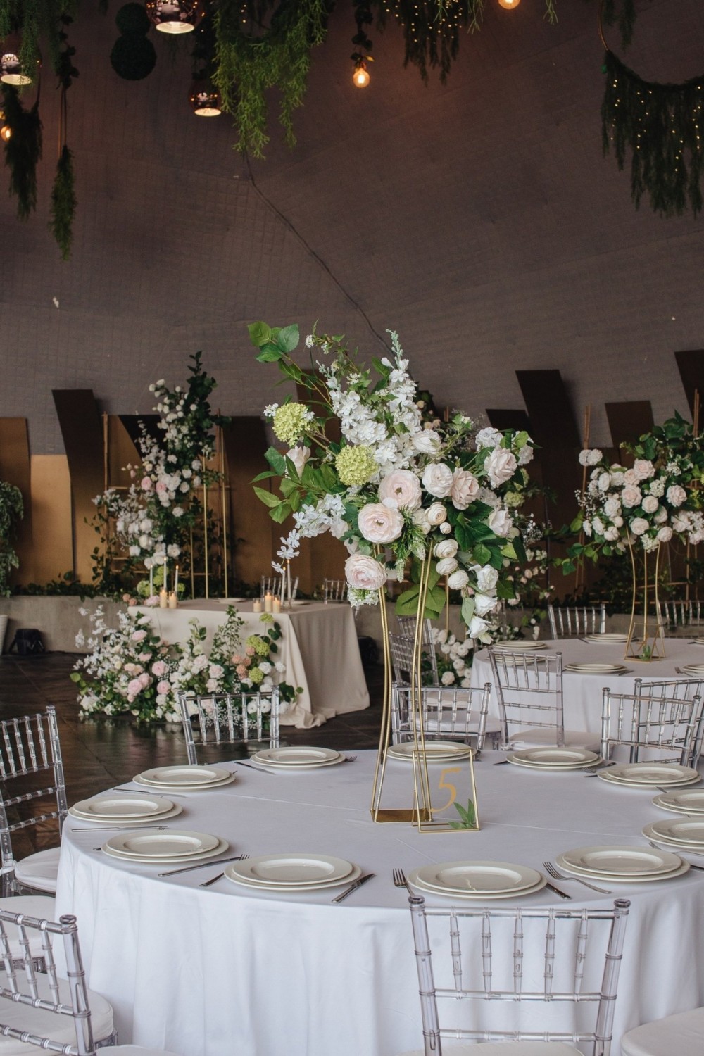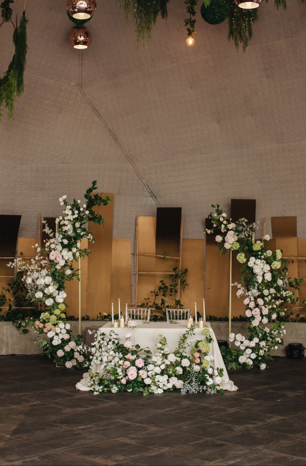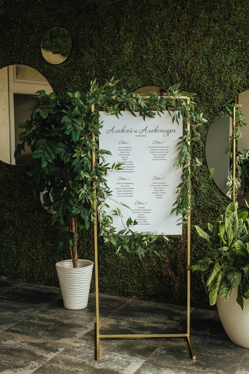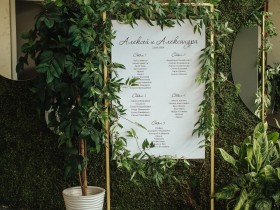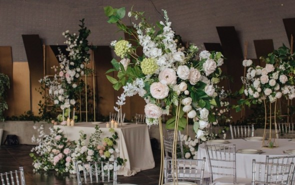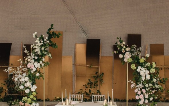 Нежная концепция в пудровых тонах с добавлением соочного лаймового результата. В основе дизайна легла форма колец, как символ вечной любви. Ее мы использовали на выездной регистрации. Лаконичная арка-кольцо прекрасно вписалась в воплощение. И обыграли похожую форму в дизайне стола для молодых. Стойки с талией на столах привели к общему положению гостей.